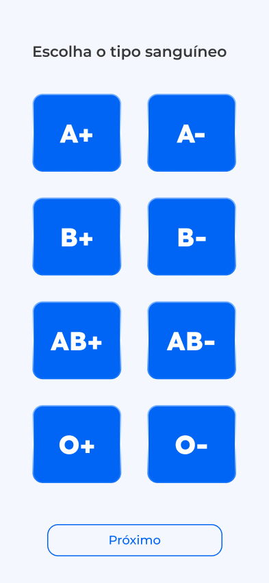 Selecione o tipo sanguíneo desejado com botões grandes pensados para fácil visualização e uso com luvas.